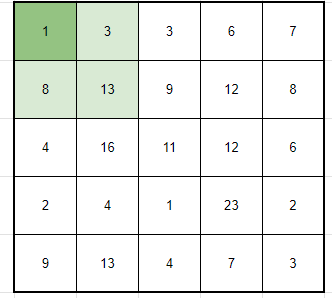 이렇게 누적합이 되다보면 자신으로부터 위쪽과 왼쪽에 있는 것이 합산에 포함되기 때문에, 그것들을 빼주고 중복으로 뺀걸 추가한 것이다.