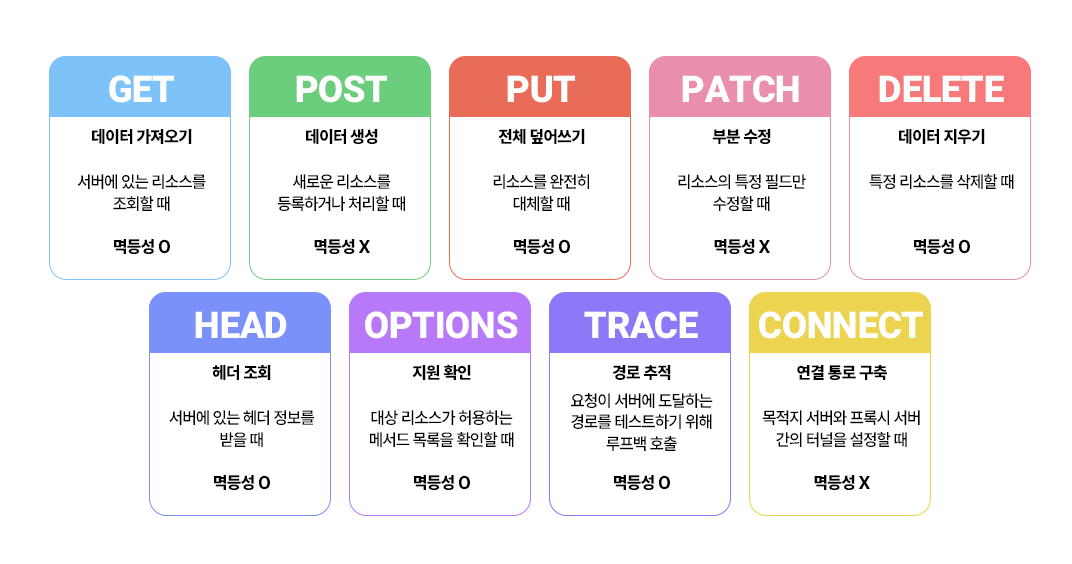 그렇다면 GET과 POST는 무슨 차이가 있을까? 그 전에 이 차이의 중점인 멱등성(Idempotency)에 대해서 짚고 넘어가야 한다. 멱등성은 연산(요청)을 여러 번 수행해도 결과가 처음과 똑같은 성질을 의미한다. GET의 경우는 멱등성이 존재하지만, POST는 존재하지 않다. 즉, GET은 10번이든 100번이든 한 차례를 한다고 하여 상태가 변화하는 일은 거의 없다. 반면 POST는, 10번, 100번하면 모두 다 적용이 된다. 우리가 등록 버튼을 여러번 연속으로 누르면 연속으로 같은 글이 등록되는 것과 같다.