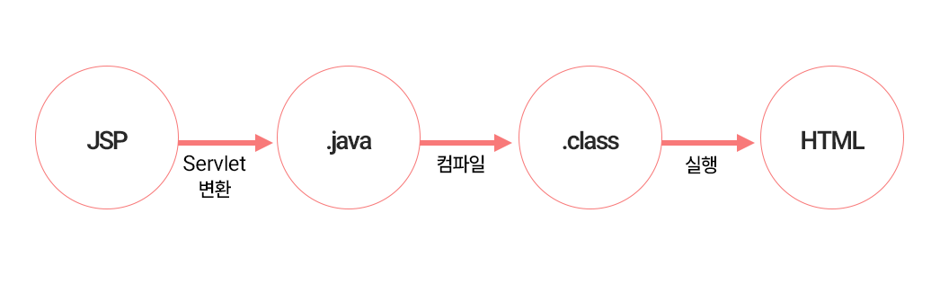 다만 브라우저는 사실 JSP를 직접적으로 읽지 못한다. 이 때문에 .jsp 파일은 WAS에 의해 자동으로 '서블릿(.java)' 파일로 변환되어, 컴파일 및 실행된다.