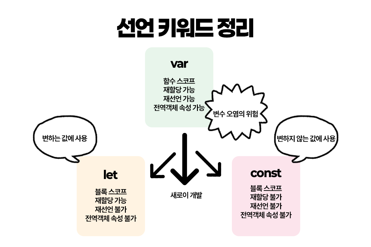 변수란, 메모리 내에 저장되어 불러와지는 임시 기억 장소이다. 식별자 등으로 명명하여 사용하는, JS 기본적인 개념 중 하나다. 이전에 일지에서 관련 내용을 정말 깔끔하게 정리해놔서, 스코프 등의 개념에 대한 설명을 제외해 키워드들에 대해서 다시 읊고, 그림으로 다시 정리하겠다.