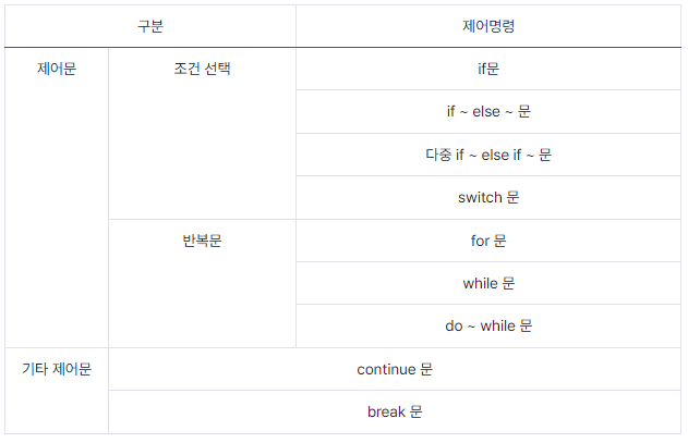 제어문이란, 프로그램의 흐름을 제어하는 문장을 의미한다. 코드의 실행 순서를 바꾸거나, 조건에 따라 분기하거나하는 것이다. 조건문이라고도 한다. 제어문은 다음과 같이 나눌 수 있다.