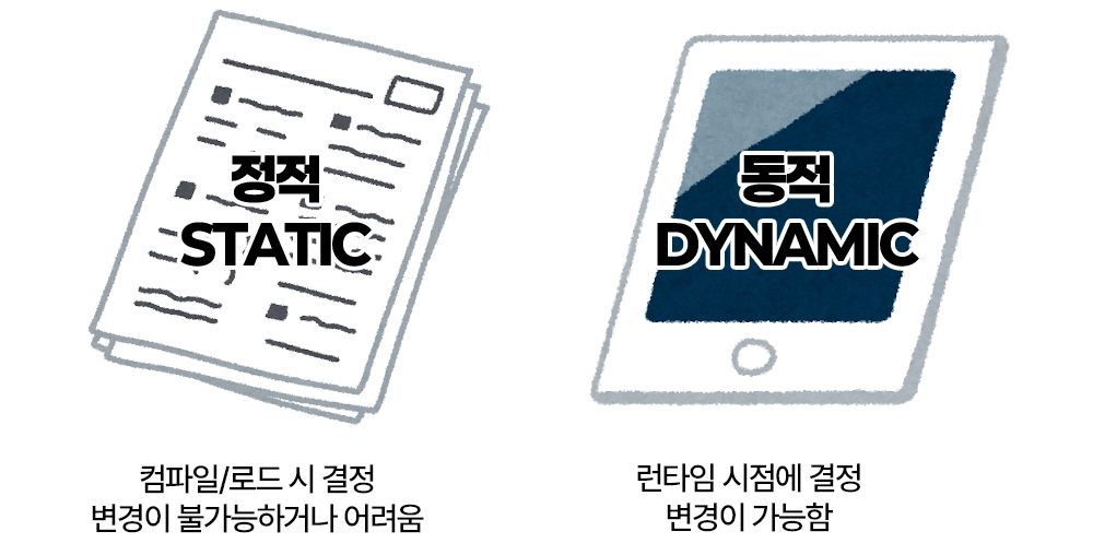 동적인 웹 페이지를 작성하기 위해 사용되는 언어라고 정의되어 있다. 여기서 동적Dynamic이라는 단어는 무엇일까? 반대로는 정적Static이 있다. 실행 중 내용이 변경될 수 있는 것을 동적이라고 표기한다. 종이와 태블릿의 차이 정도라고 비유하는데, 종이는 잉크로 한번 쓰면 고치기 어렵지만 태블릿은 전자잉크로 언제든지 다시 고칠 수 있기 때문이다.