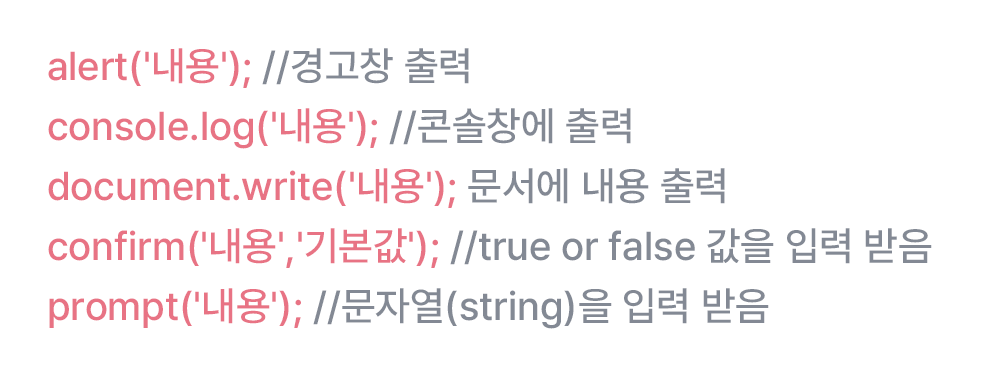 그 전에, 데이터를 입력 및 출력하는 것을 지원하는 입출력 메서드를 간단히 톺아보고 간다. 이들은 정말 기초적인 것으로, 데이터를 브라우저(클라이언트)에서 받거나 미리 입력한 내용을 출력하기 위해서 있다. 특히 console.log는 개발자라면 많이 사용하게 된다.