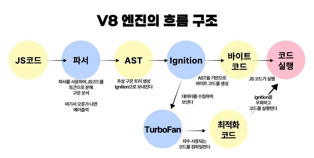 본래는 Full-Codegen이라고 하는 JIT 컴파일러를 사용했는데, Full-Codegen은 전체 파일을 한 차례 컴파일하는데, 이것이 메모리 점유를 많이 하기 때문에 Ignition과 TurboFan에 의해서 인터프리팅과 최적화 컴파일링으로 메모리 점유를 낮추고, 기존 전통적인 방식보다 더 빠르게 구동할 수 있도록 실행할 수 있게 만든 것이다. 이에 따른 과정은 다음처럼 거친다고 할 수 있다.