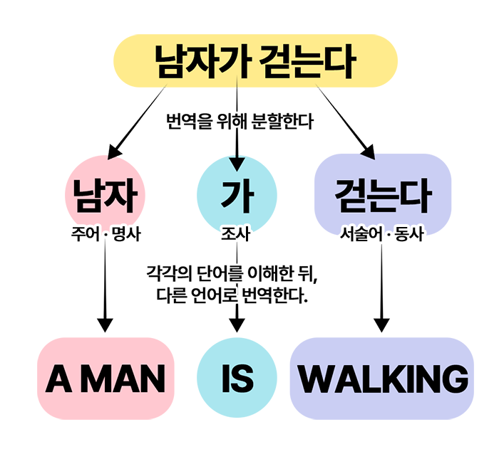 토큰화는 파싱의 첫 단계이기 때문에, 파서(Parser)에 포함되어 설명된다. 이 파서 전체 과정에 대해서 간단히 말하면 번역기가 돌아가는 것과 비슷하다. 남자가 걷는다를, A man is walking으로 번역하기 위해서는, 남자/가/걷는다로 분할해야 한다. 그리고 남자는 명사, 가는 조사, 걷는다는 동사로 구조를 분석하여, 각각의 단어를 영어로 바꾸는 것이다. 이에 대해서는 아래 이미지와 같이 이해할 수 있다.