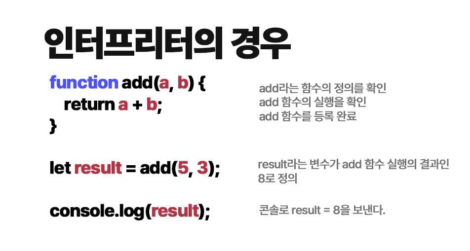 먼저 JavaScript의 언어 중 특이한 점은, 인터프리터 언어라고 적혀 있지만 사실상 컴파일도 실행한다는 것이다. 인터프리터와 컴파일러? 개념에 대해서 생소한 사람이 많을 테니 그 부분부터 짚어보자.