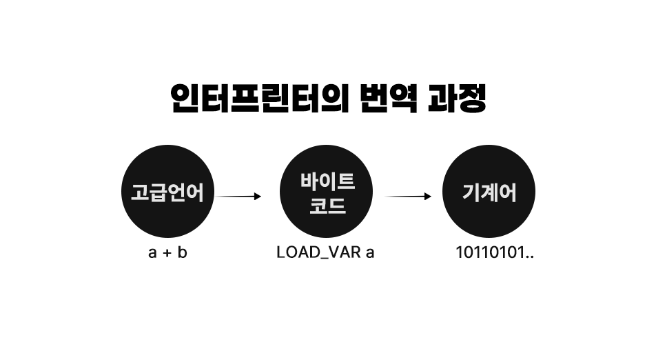 그러나 인터프리터는 여기에 한 가지가 더 추가된다. 그것이 바로 바이트코드Bytecode이다. 바이트코드는 사람이 작성한 고급언어/프로그래밍 언어를 기계어로 번역하기 위해서 한 차례 거치는 '중간 단계'라고 할 수 있다. 이 바이트코드가 어째서 인터프리팅에 필요하냐면, 바로 그 특이성 때문이다. 한 줄마다 분석하여 실행하기 때문에, 바이트코드를 거쳐 기계어로 번역을 한 차례 거칠 수밖에 없다. 혼자서 외국어 공부를 할 때는 외국인의 말을 전체 통역해도 괜찮겠지만, 외국인과 대화할 때는 하나하나 통역을 할 수밖에 없다. 그리고 이 통역을 담당하는 것이 통역사이듯, 바이트코드 또한 중간단계라고 할 수 있다.