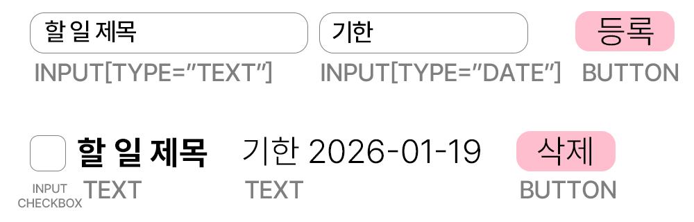 다만 전자 todo list의 경우 등록 및 삭제가 필요하기 때문에, 이에 대한 부분도 필요하다. 그렇다면 삭제 버튼을 할 일의 목록에 넣도록 하고, 등록에 대한 세부도 정해야한다. 지금까지 넣어야할 것은 (1) 할 일(제목)에 대한 입력 (2) 기한에 대한 입력 (3) 등록 버튼 일 것이다.