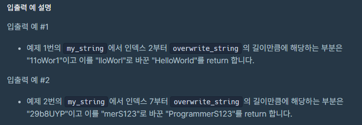 즉, my_string.substring(0, s) + overwrite_string + my_string.substring(overwrite_string.length()) 형태로 이어붙여서 반환하면 된다.