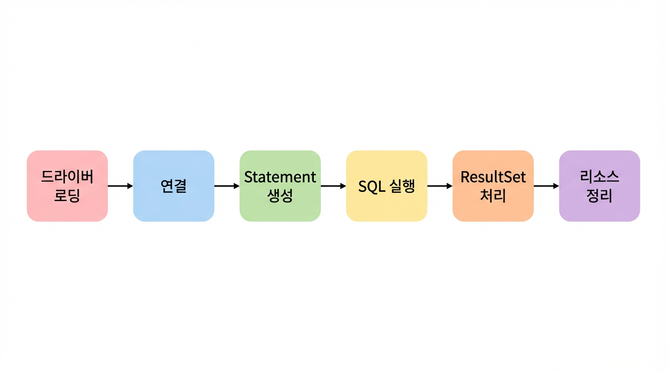 JDBC로 DB를 다루는 기본 순서는 항상 비슷하다. 연결(Connection) → SQL 실행(Statement 또는 PreparedStatement) → 결과 처리(ResultSet) → 리소스 정리(close). 이 네 단계로 기억해 두면 된다.