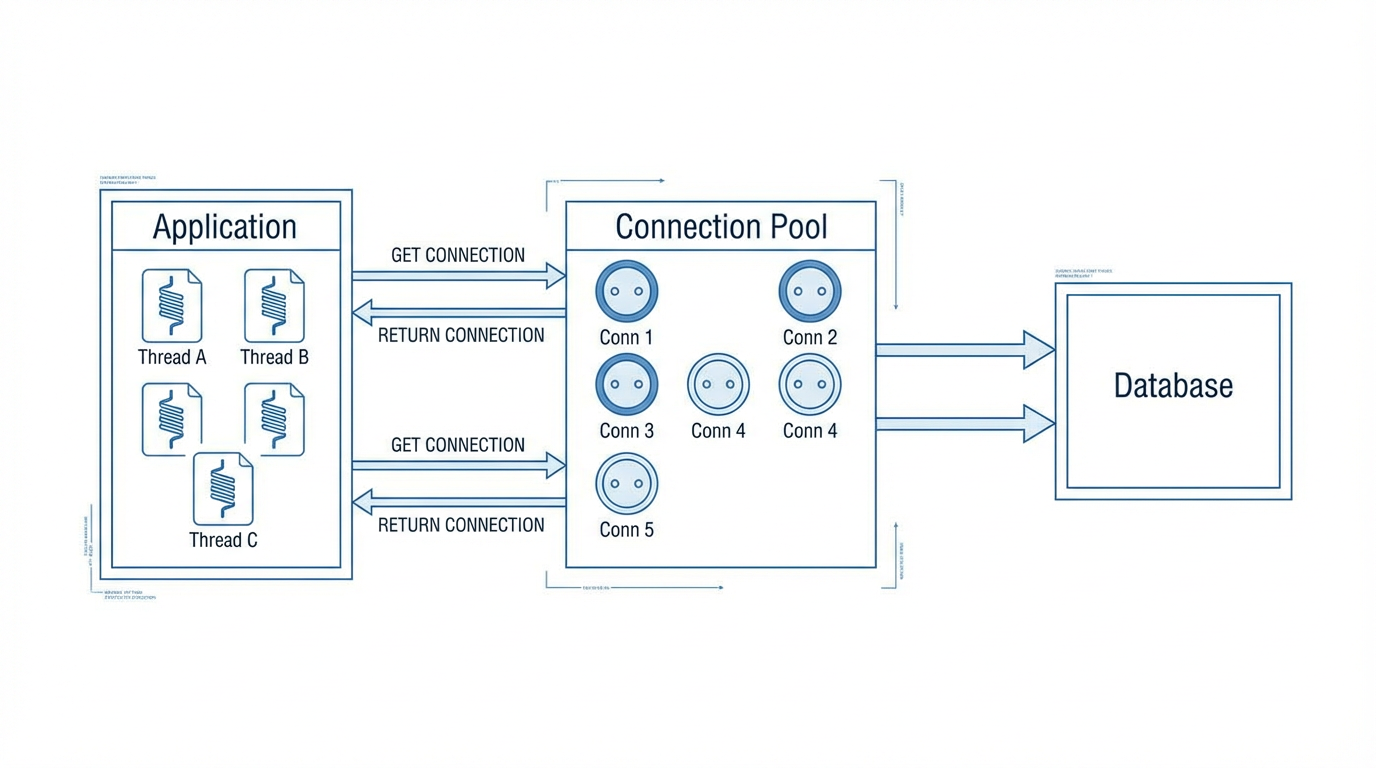 Connection Pool은 미리 여러 개의 Connection을 만들어 두고, 애플리케이션이 요청할 때 빌려 주고(getConnection), 사용이 끝나면 반환(close라고 부르지만 실제로는 풀에 돌려줌)하는 방식이다. 도서관에서 책을 빌리듯이, 연결을 "빌려 쓰고" "반납"하는 것이다. 매번 새로 연결을 만들면 TCP 핸드셰이크나 DB 인증 같은 비용이 반복되니까, 미리 만들어 둔 걸 재사용하는 편이 훨씬 빠르다. HikariCP, Apache DBCP, Tomcat JDBC Pool 등이 널리 쓰이고, Spring Boot 기본이 HikariCP다. 설정(예: application.properties)에 maximum-pool-size, minimum-idle 같은 값만 넣어 주면 풀이 동작한다.