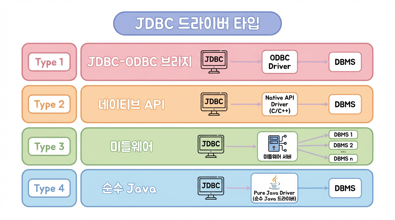 Type 1은 JDBC-ODBC 브리지라고 해서, 예전에 쓰이던 방식이고 지금은 레거시에 가깝다. Type 2는 네이티브 API를 부분적으로 사용하는데, DB 클라이언트 라이브러리를 따로 설치해야 하는 부담이 있다. Type 3은 순수 Java로 된 미들웨어를 거쳐서 DB에 접근하는 방식이다. Type 4는 순수 Java로, DB 프로토콜을 직접 사용하는 방식이다. 100% Java로 작성되어 있어서 DB 벤더가 제공하는 JAR 하나만 프로젝트에 라이브러리로 추가하면(classpath에 넣으면) 된다. 별도로 네이티브 라이브러리를 깔 필요가 없어서 가장 쓰기 편하다.